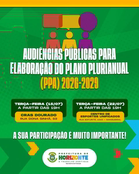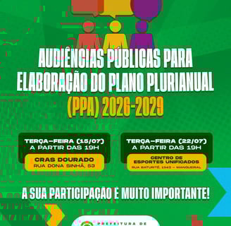 O futuro da nossa cidade começa com você! Chegou a sua hora de fazer a diferença! Participe da elaboração do Plano Plurianual (PPA) 2026-2029 e ajude a definir as prioridades, investimentos e projetos que vão transformar a vida de toda a população nos próximos quatro anos.